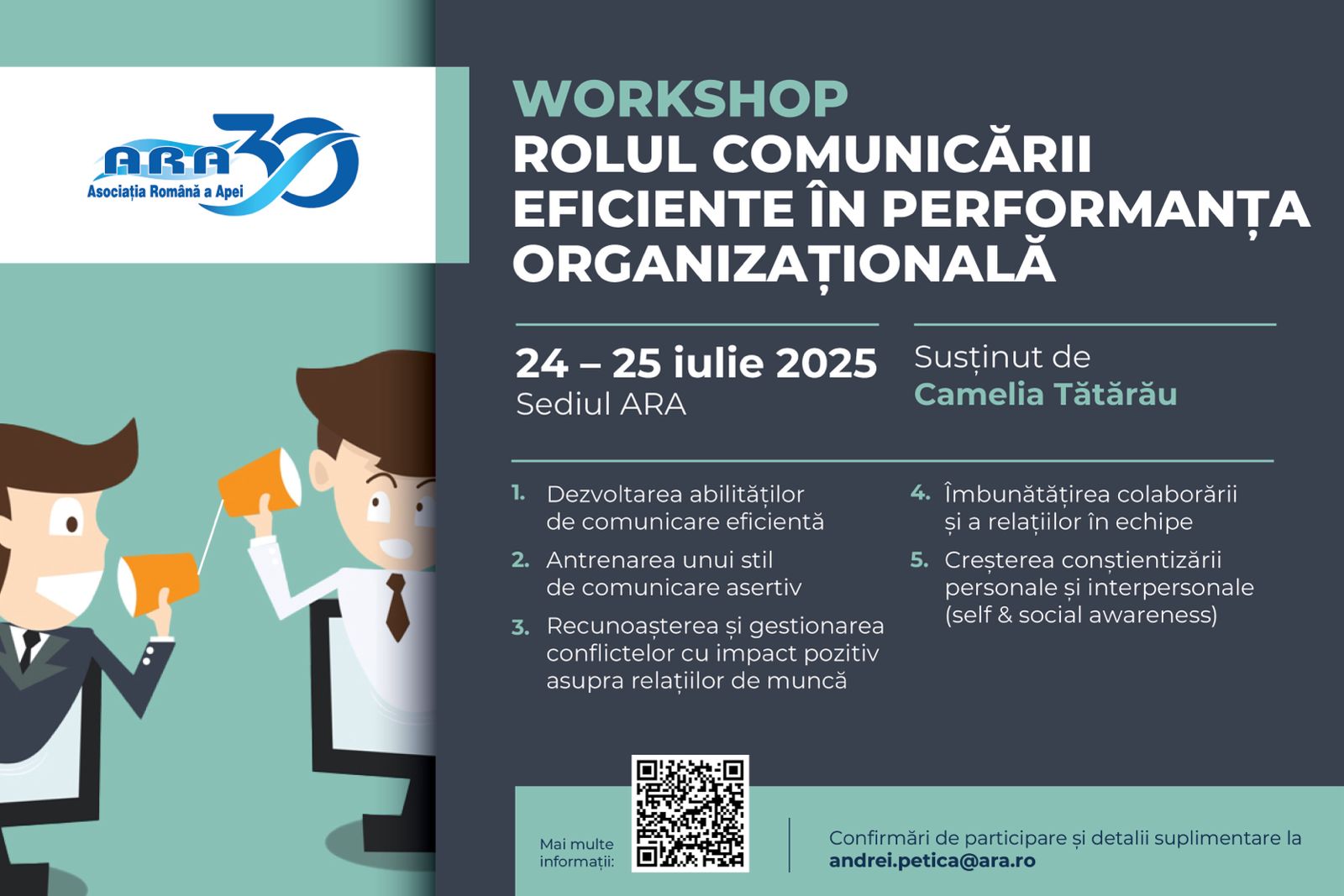 Acest workshop este organizat în cadrul Pilonului strategic 2 CFP ARA – cursuri, workshop-uri etc soft skills, utile în interiorul companiilor și în gestionarea ecosistemului extins din care face parte pentru a putea performa la cel mai înalt nivel