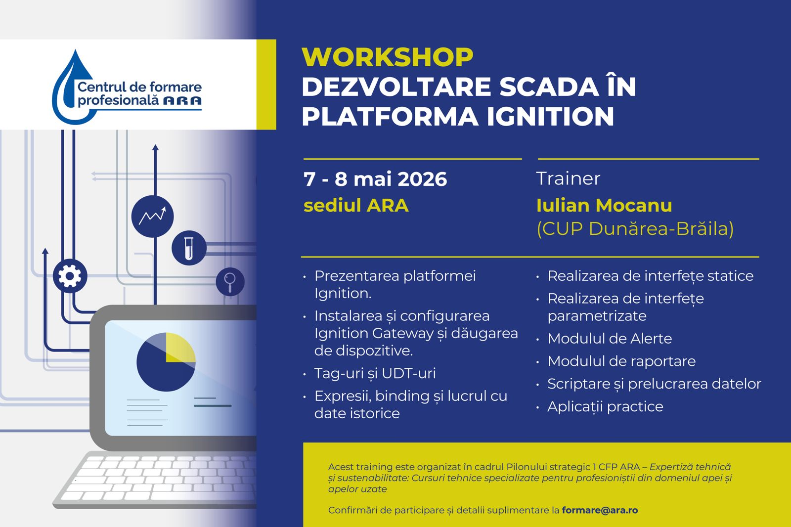 Acest workshop de două zile oferă participanților ocazia să învețe cum pot folosi platforma Ignition pentru a dezvolta un sistem SCADA modern și versatil, lucrând cu modulul Perspective. Pe parcursul său se vor detalia toți pașii necesari pentru a pune platforma în funcțiune, începând cu instalarea și configurarea platformei, adăugarea de dispozitive prin citirea memoriei unui PLC virtual și terminând cu realizarea unor interfețe utilizabile.